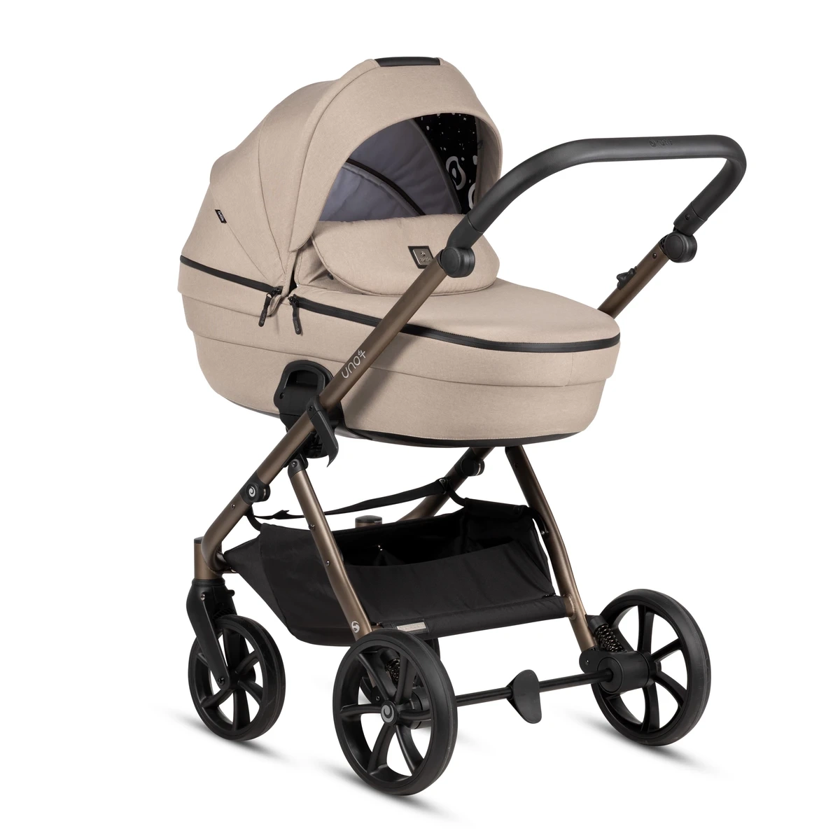 Model Uno6+ wyróżnia się także wyjątkowymi właściwościami jezdnymi. Koła z technologią TUTIS ALL-ROAD™ zapewniają stabilność i doskonałą przyczepność zarówno na twardym miejskim podłożu, jak i na bardziej wymagających trasach. Tłumienie wstrząsów wspierają amortyzatory przedniego widelca oraz niezależna adaptacyjna amortyzacja kół tylnych, która reaguje osobno na każde nierówności. Efektem jest niezwykle płynna jazda, bez drgań i dyskomfortu – zarówno dla rodzica, jak i dziecka. Z kolei lekka, wytrzymała rama o wadze jedynie 7,8 kg pozwala na szybkie, precyzyjne manewrowanie, a także łatwe składanie do kompaktowych rozmiarów. Wózek posiada również praktyczne funkcje, takie jak dyskretne zapięcia magnetyczne, przedłużana budka z wentylacją, regulowany uchwyt z ekoskóry oraz pojemny, otwarty kosz na zakupy – idealny podczas codziennych wyjść.