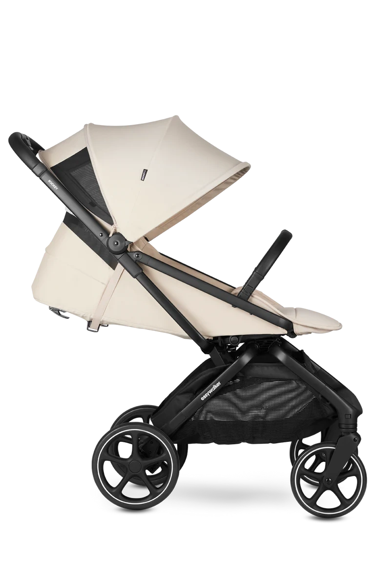 Twoje dziecko może cieszyć się przestronnym siedziskiem, które płynnie przechodzi z pozycji całkowicie pionowej do całkowicie płaskiej, zapewniając komfort i optymalną postawę.