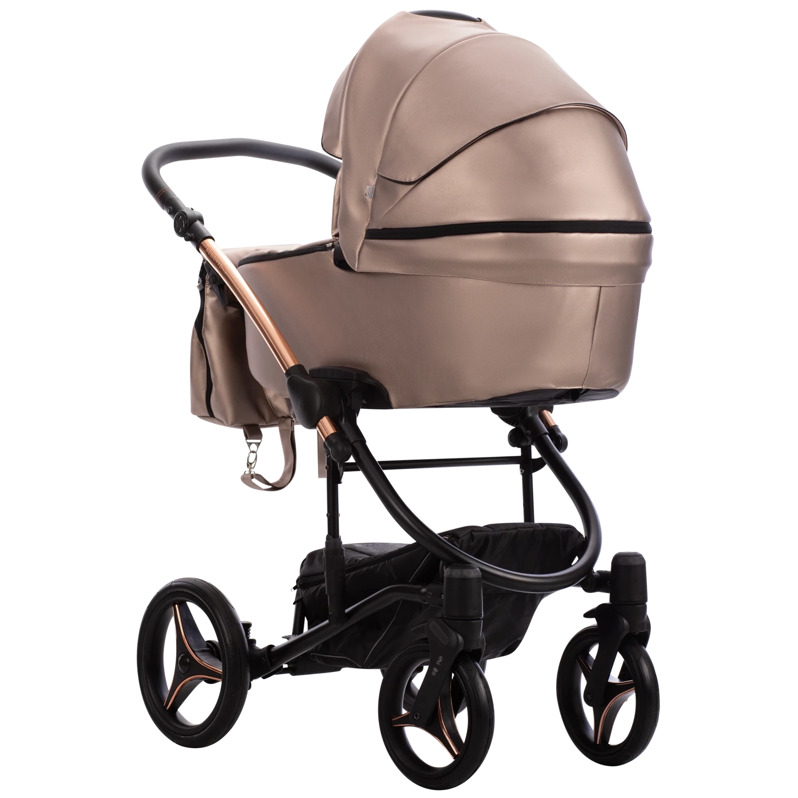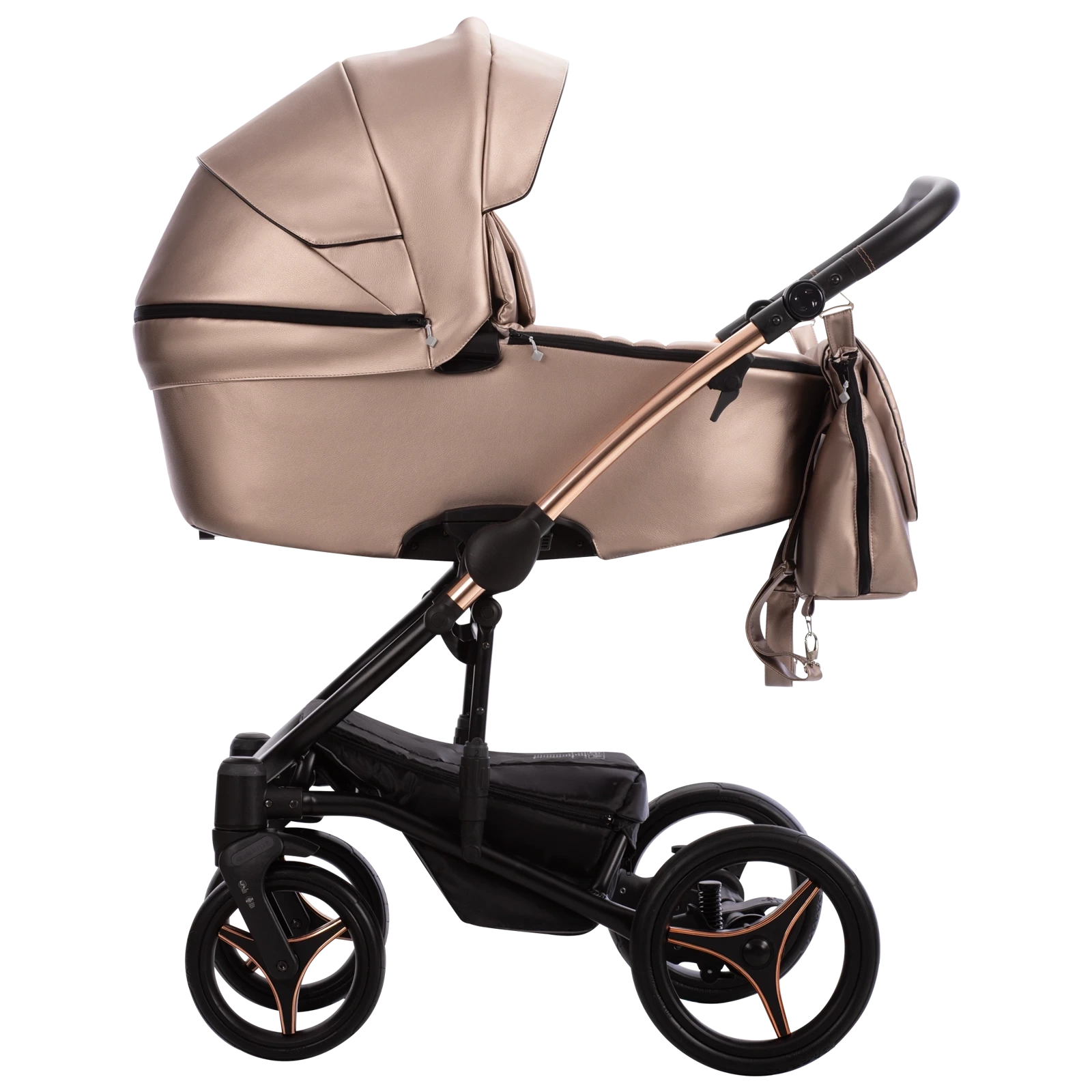 Dla tych, którzy szukają czegoś więcej, Bebetto Torino Pro to wybór pełen blasku i funkcjonalności. Stelaż o unikalnym designie, częściowo anodowany w miedzi, pokryty białym lub czarnym lakierem, nadaje wózkowi niezwykłego charakteru. Dodatkowo, boczny regulowany amortyzator Soft/Hard umożliwia szybką adaptację zawieszenia do warunków terenowych, gwarantując wyjątkowy komfort jazdy w trybie twardym lub miękkim. Bebetto Torino Pro to nie tylko wózek – to stylowy kompan podróży dla Twojego malucha.