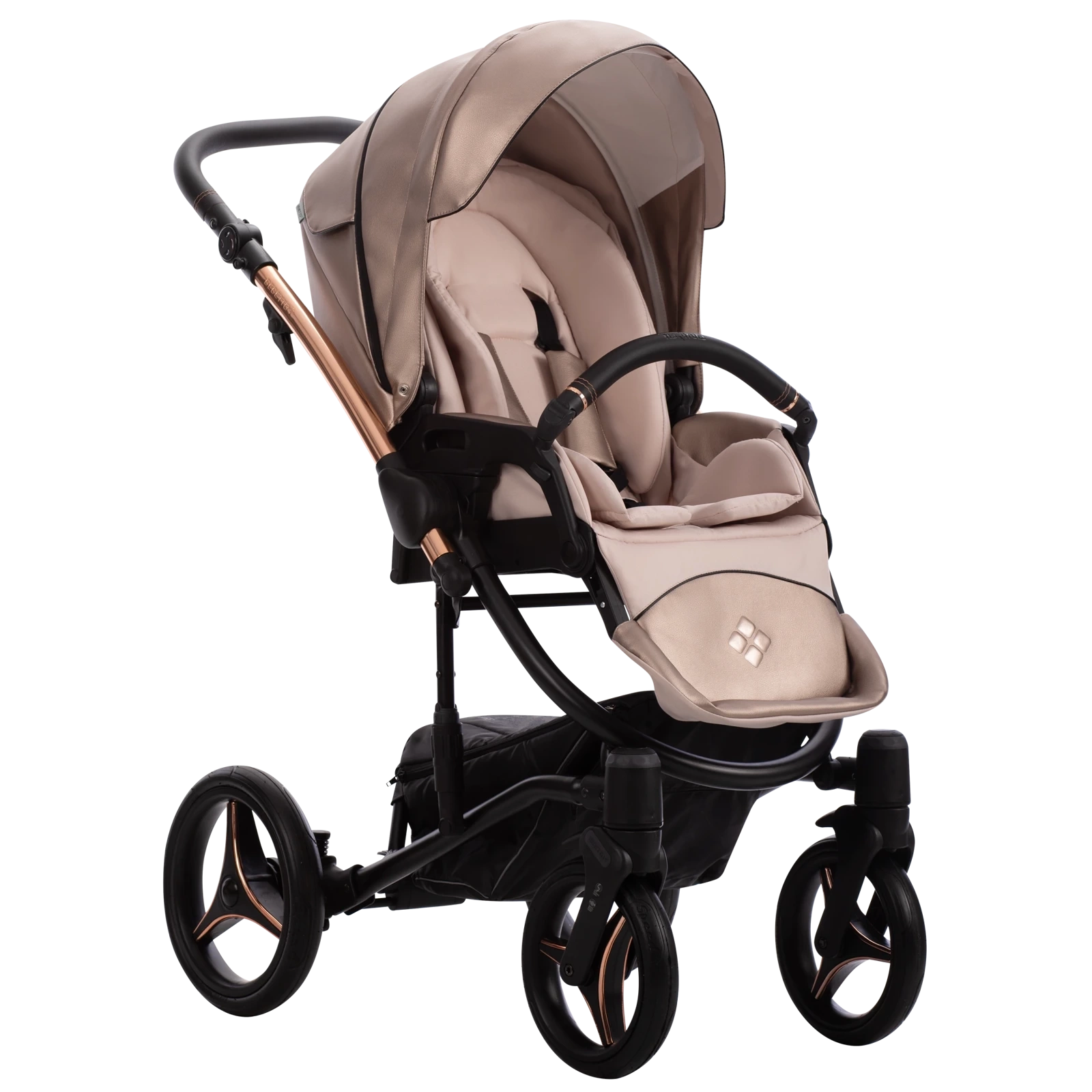 W wersji spacerowej, materacyk wykonany z materiału w kolorze tapicerki dodatkowo podkreśla luksusowy charakter wózka. Szybkie wypinanie barierki ułatwia komfortowe układanie dziecka w spacerówce, a regulowane pasy gwarantują podróż w pełni bezpiecznych warunkach.