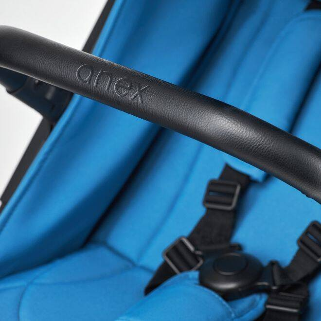 Wózek spacerowy Anex Air-X wyposażony jest w pięciopunktowe pasy bezpieczeństwa z miękkimi ochraniaczami oraz barierkę. Barierkę można wypiąć z jednej strony lub całkowicie co ułatwia wkładanie i wyjmowanie dziecka z wózka.