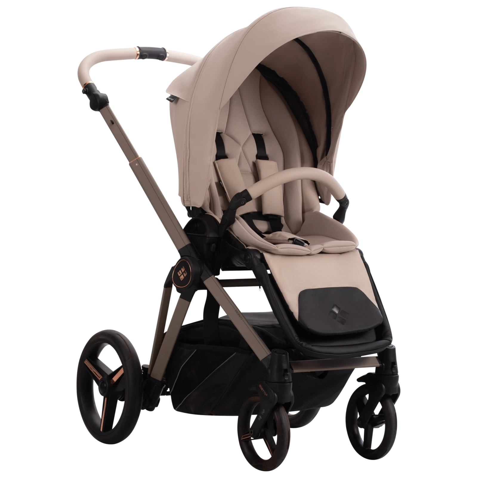 Spacerówka Monti to połączenie komfortu, funkcjonalności i bezpieczeństwa. Regulowane oparcie i podnóżek pozwalają na idealne dopasowanie wózka do potrzeb rosnącego dziecka. Budkę zintegrowano z oparciem i siedziskiem, dzięki czemu przy zmianie pozycji oparcia automatycznie rozszerza się, zapewniając maksymalną wygodę. Wózek jest przeznaczony zarówno dla noworodka, jak i starszego dziecka – aż do 22 kg (około 4. roku życia). Pięciopunktowe pasy z magnetyczną sprzączką są niezwykle wygodne i wyposażone w miękkie ochraniacze, a ich długość rośnie wraz z dzieckiem. Spacerówka ma również miękki, estetyczny materacyk oraz odpinaną barierkę, którą można usunąć jednym ruchem. Siedzisko można zamontować zarówno przodem, jak i tyłem do kierunku jazdy. Co więcej, całą spacerówkę da się złożyć do kompaktowych rozmiarów bez konieczności demontowania siedziska. Dodatkowy pasek do przenoszenia umożliwia wygodne zawieszenie jej na ramieniu.