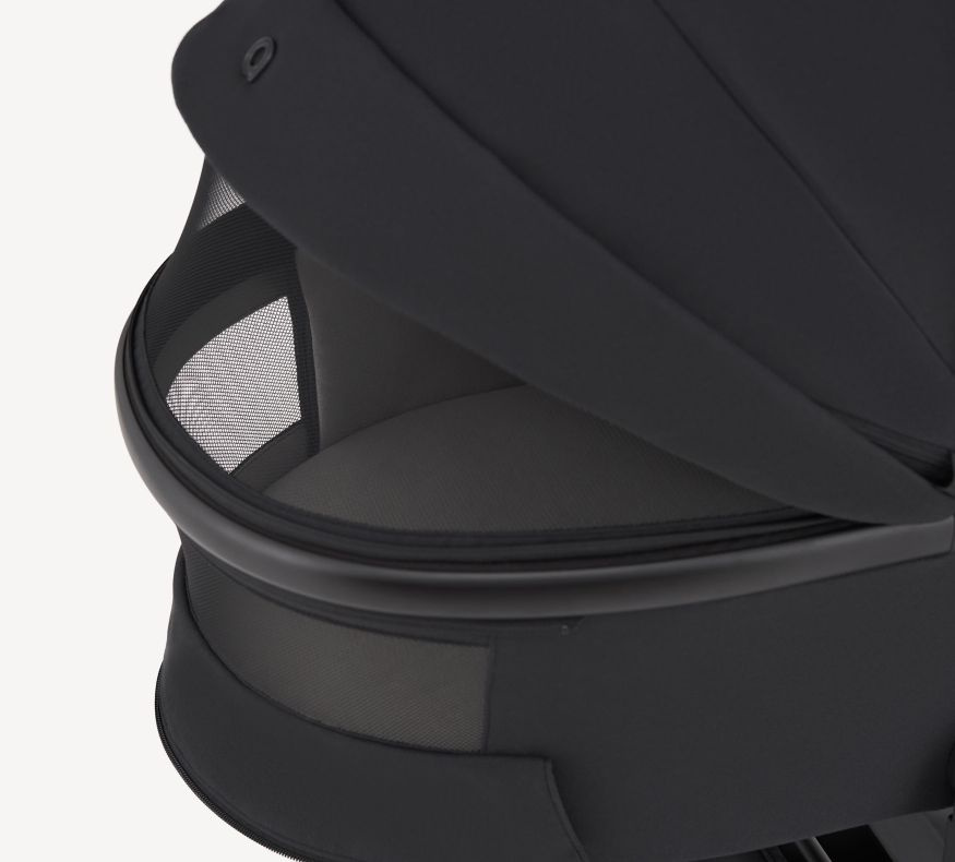 Wózek posiada zaawansowany system wentylacji, zapewniający przepływ powietrza we wszystkich kluczowych miejscach – od budki i przedniej części gondoli po podnóżek i budkę siedziska.