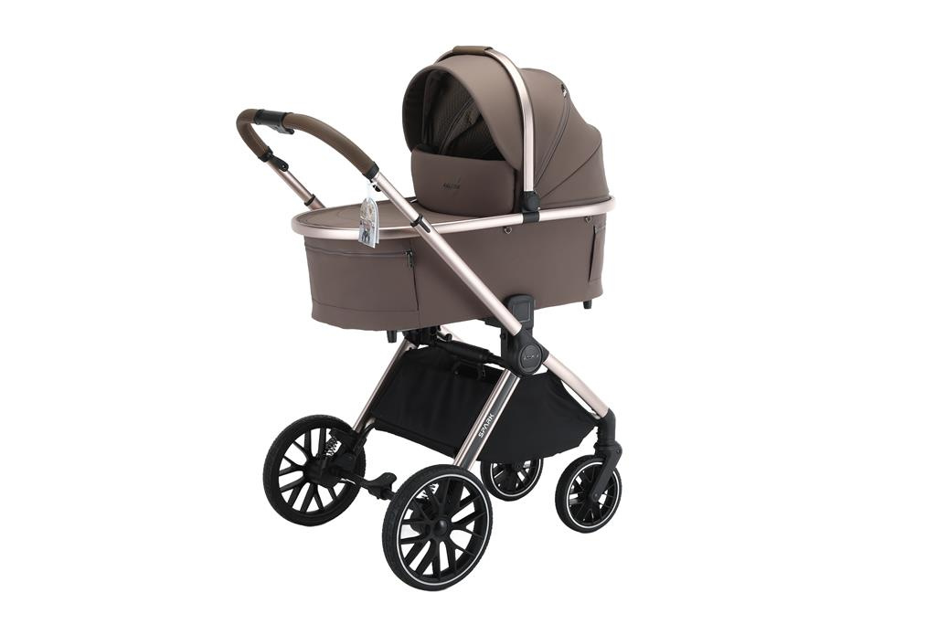 Wózek dziecięcy Adamex SPARK 2w1 to propozycja dla rodziców, którzy poszukują połączenia nowoczesnego designu, wysokiej jakości wykonania oraz praktycznych rozwiązań ułatwiających codzienne spacery. Model ten został zaprojektowany z dbałością o każdy detal, aby zapewnić maksymalny komfort dziecku już od pierwszych dni życia, a jednocześnie pełną wygodę prowadzenia dla rodziców. Wersja Champagne wyróżnia się anodowanym stelażem w kolorze szampańskiego złota oraz eleganckimi dodatkami w odcieniu ciemnego poleru, co nadaje całości wyjątkowo prestiżowego charakteru.