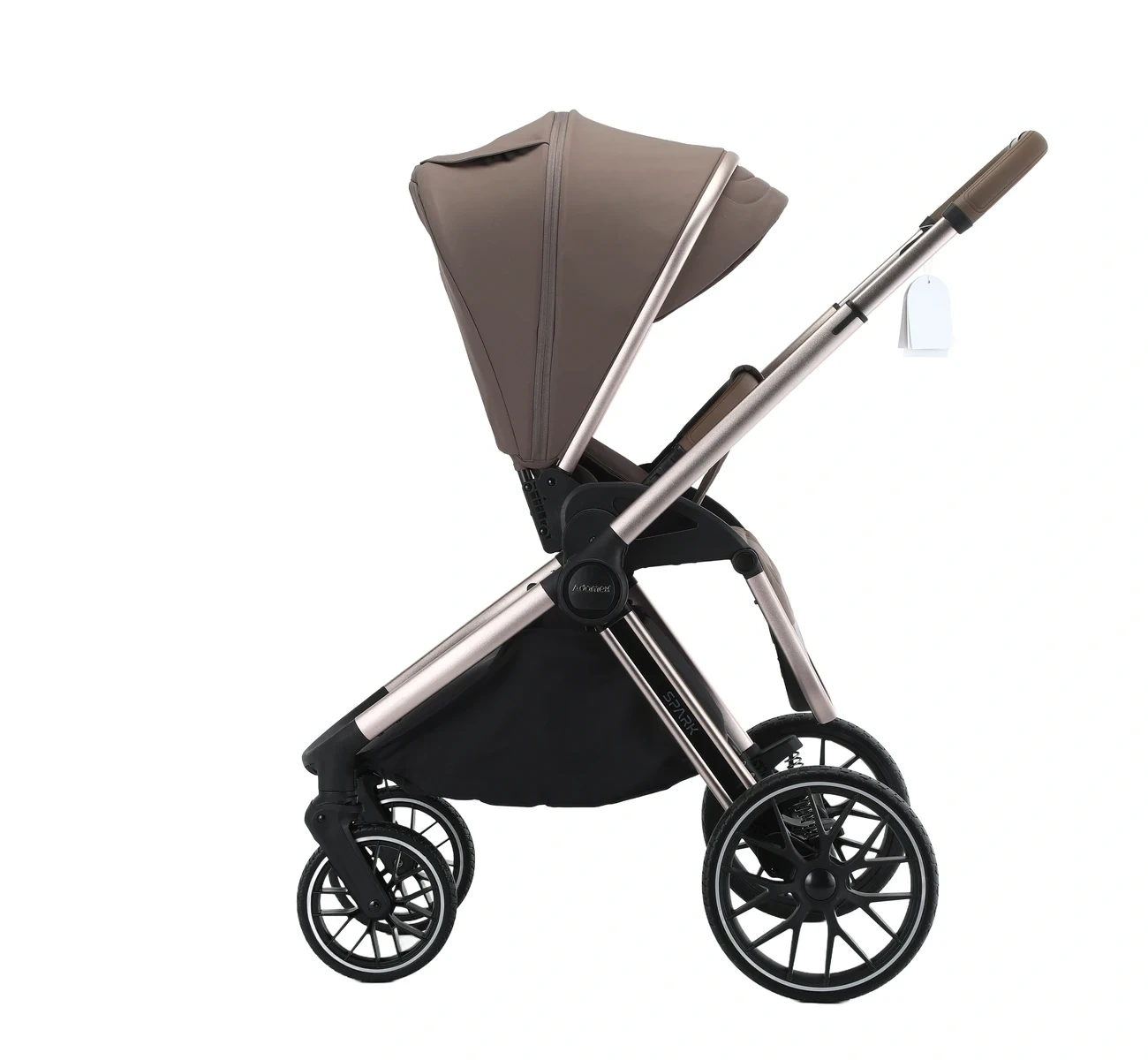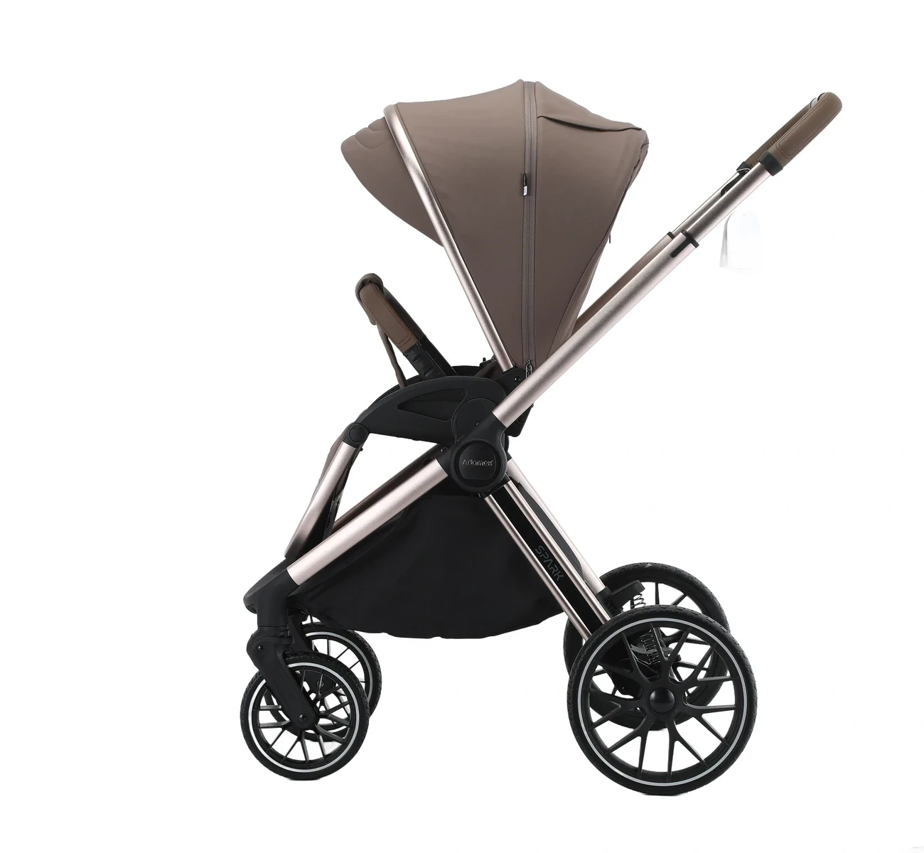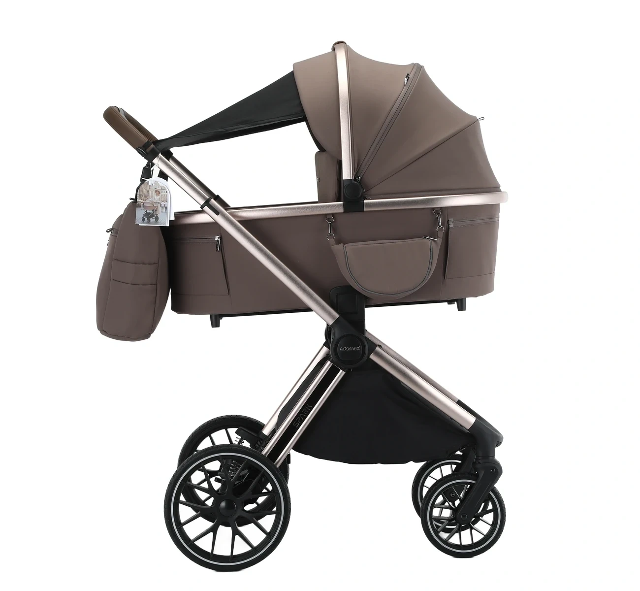 Wózek dziecięcy Adamex SPARK 2w1 to propozycja dla rodziców, którzy poszukują połączenia nowoczesnego designu, wysokiej jakości wykonania oraz praktycznych rozwiązań ułatwiających codzienne spacery. Model ten został zaprojektowany z dbałością o każdy detal, aby zapewnić maksymalny komfort dziecku już od pierwszych dni życia, a jednocześnie pełną wygodę prowadzenia dla rodziców. Wersja Champagne wyróżnia się anodowanym stelażem w kolorze szampańskiego złota oraz eleganckimi dodatkami w odcieniu ciemnego poleru, co nadaje całości wyjątkowo prestiżowego charakteru.